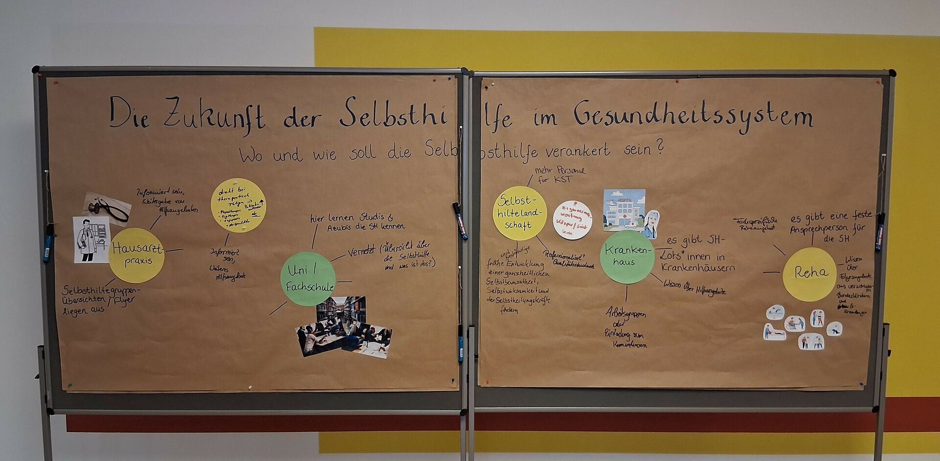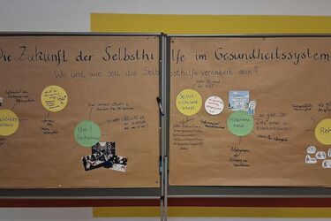 Im Foyer lud den ganzen Tag über eine große Kreativwand dazu ein, eigene Visionen und Wünsche zur Zukunft der Selbsthilfe im Gesundheitssystem zu teilen. Unter der Frage „Wo und wie soll die Selbsthilfe verankert sein?“ kamen kleine und große Ideen zusammen.